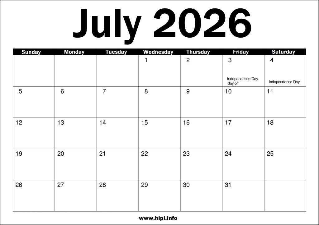 July 2026 Calendar Printable with holidays 10/28/2025 by Hipi 2026 July Printable Calendar with holidays A4 Size, Free download, Landscape Calendar July 4, 2026 – Saturday, Independence Day July 2026 Monthly Calendar with US Federal Holidays Click on image to download HD JPG image Related Posts:June July Calendar 2026 with holidaysJuly & August Calendar 2026 with holidays2025 July Calendar Printable with HolidaysJuly 2026 Calendar Free Printable