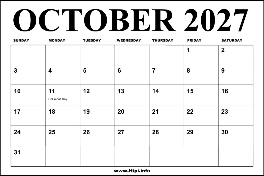 Free Printable October 2027 Calendar.