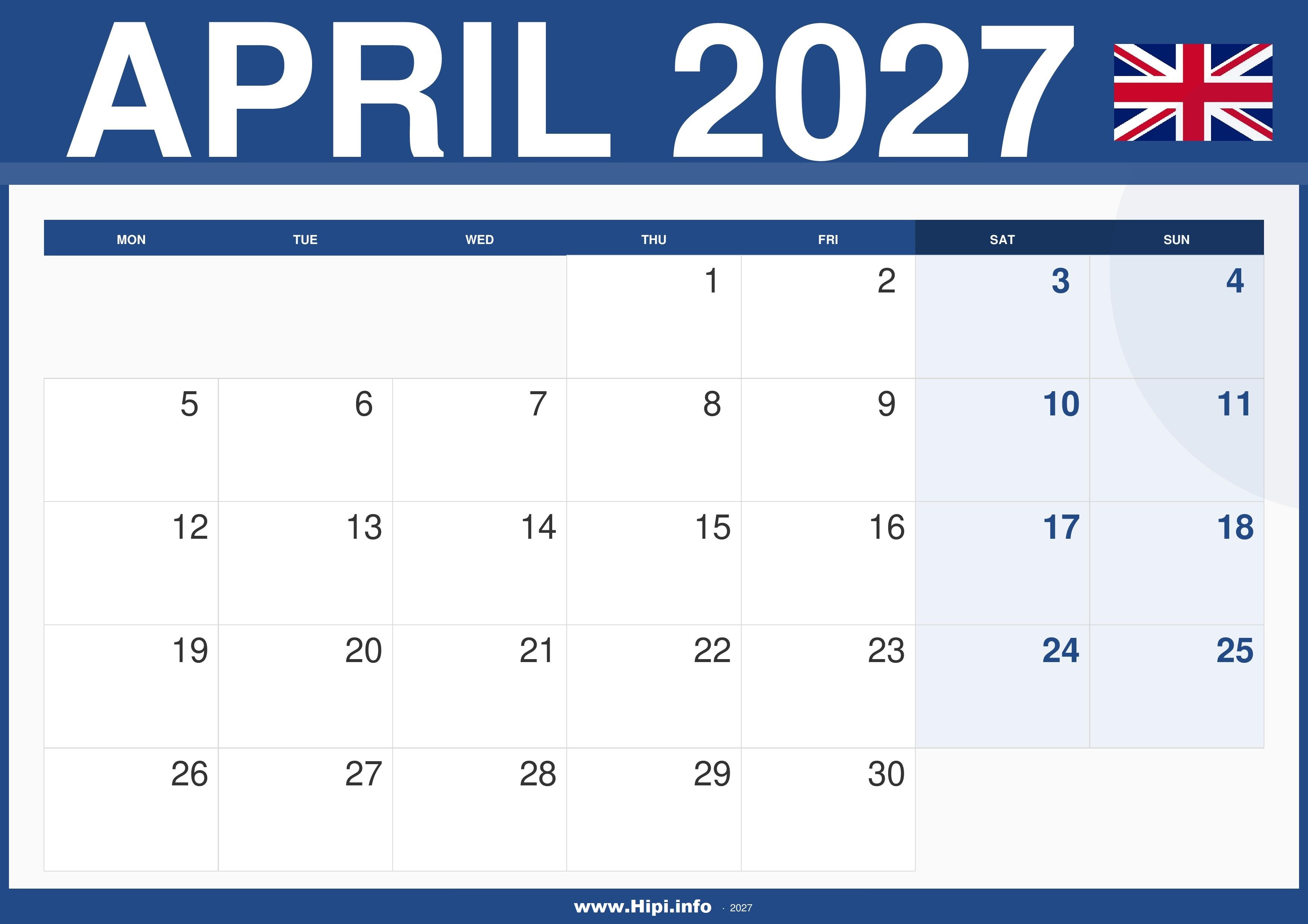 A4 printable monthly calendar UK 2027 April.