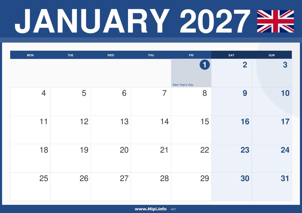 2027 January UK Calendar with Bank Holidays