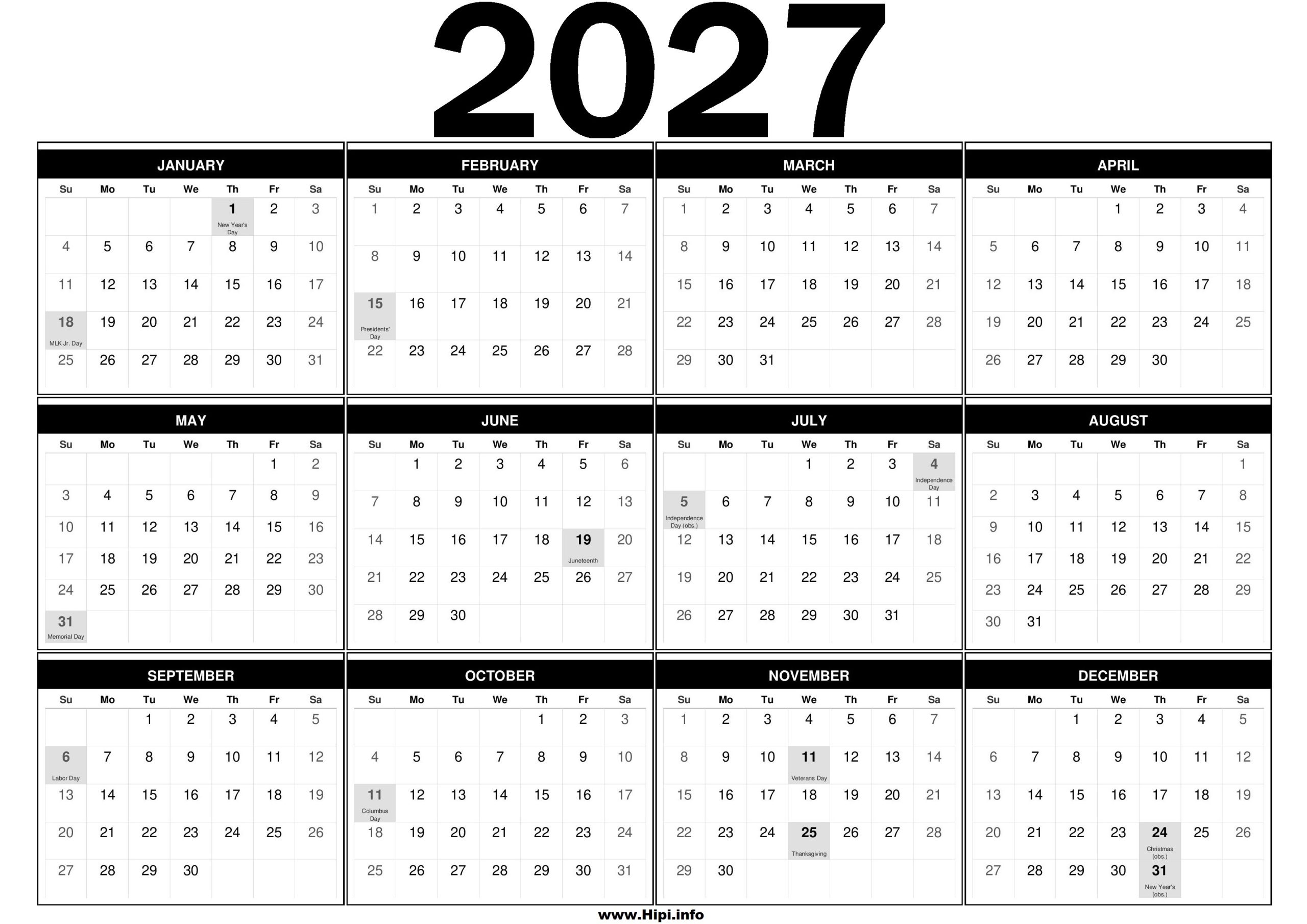 2027 Calendar with Holidays – Free Printable