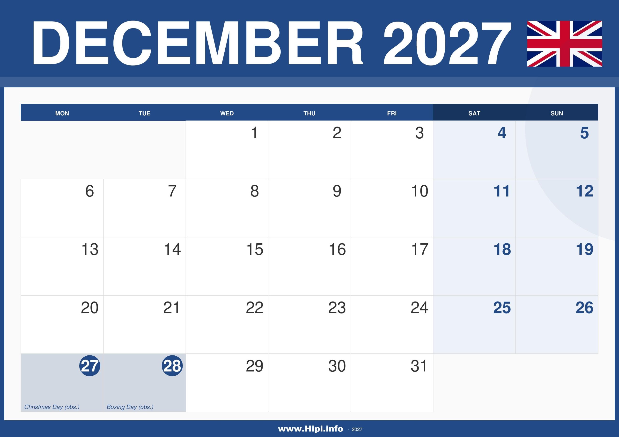 2027 December UK Printable Calendar with UK Public holidays. Monday Start UK Calendar 2027 one page per month printable. 27 December 2027, Monday – Christmas Day (Observed) 28 December 2027, Tuesday – Boxing Day (Observed) UK December 2027 Calendar Monthly with Bank Holidays. (Free Printable JPG) Stylish A4 Size Template. Swiss Grid, Clean layout, easy … Read more
